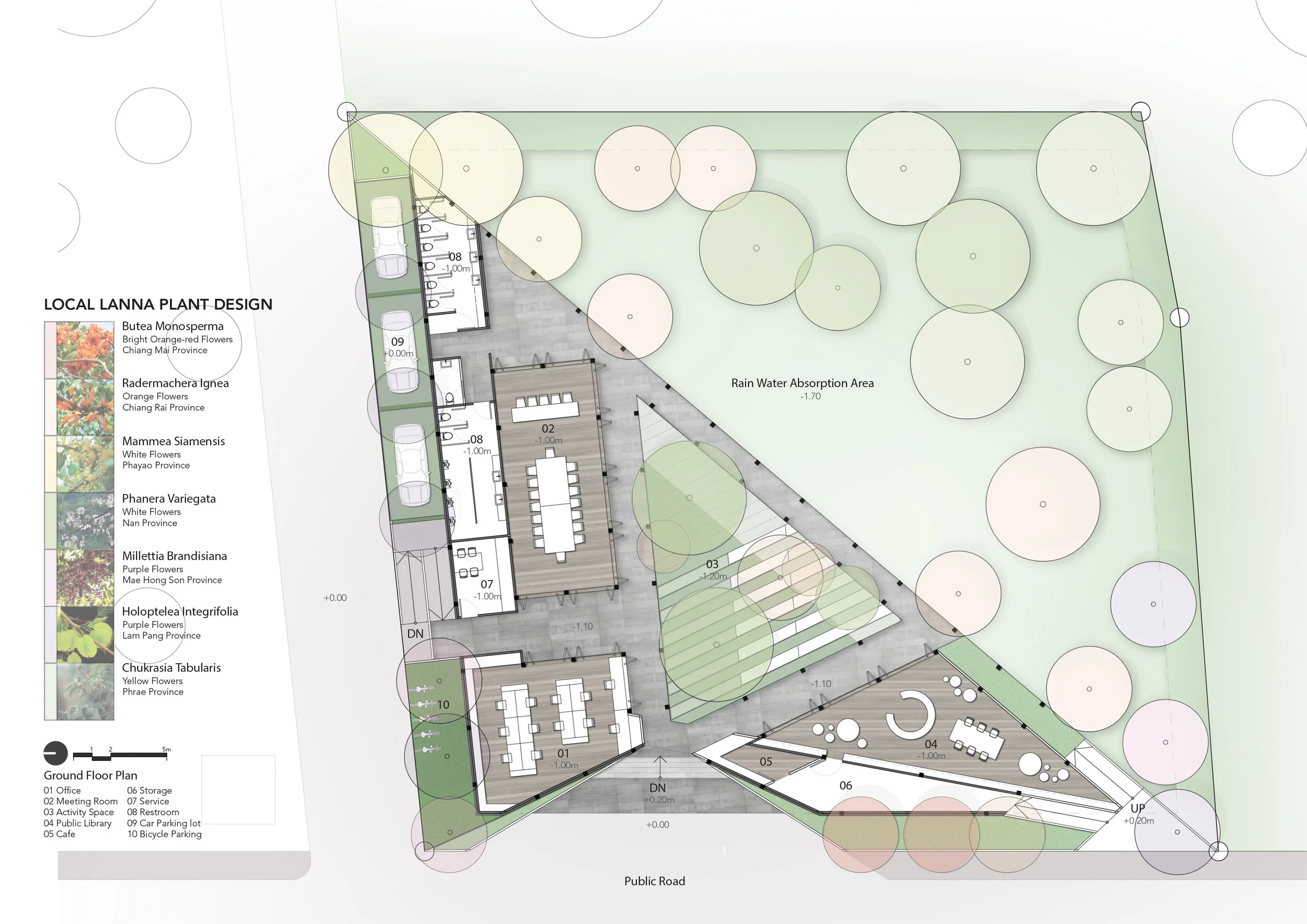 Chiang Mai was the former capital of the Kingdom of Lanna and became a state of Thailand since 1910. The city is situated in the North of Thailand and surrounded by greenery highest mountains. Because of population growth and urban sprawling, an agricultural city like Chiang Mai has depleted its natural resources by deforestation. In the rainy season, heavy rainfall from deforested mountains contributes to major flood. As Chiang Mai is in a valley with the Ping River cutting through it, the city dwellers suffer from this flooding period. During the dry season from February to April, the air pollution from slash-and-burn farming has also exacerbated environmental issues. Moreover, economic changes have caused estrangement between local people resulting in severe confrontation. ASA Lanna Center is intended to be a meeting place for architects and local people living in the northern part of Thailand. The project’s site is located in the suburban area of Chiang Mai bounded by green scenery. We propose sustainable solutions to the problems of this city and design an architectural prototype that raise people's awareness of preserving natural resources, reduce crises and strengthen relationship of local people.