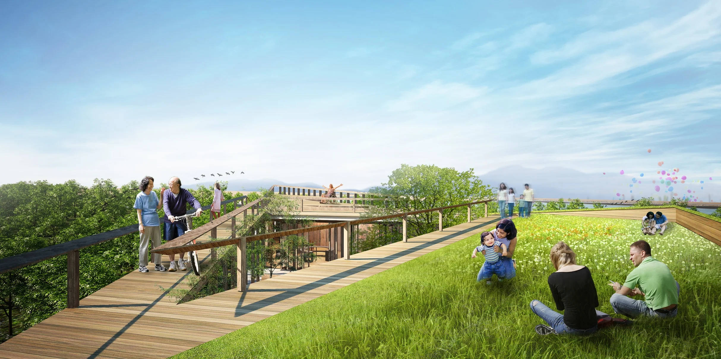 In order to maximize green space and minimize building footprint, the team proposes a triangular form for the building rather than a vast construction site covering up the whole area. A mound of earth is left to project conceptual boundary as well as to absorb and defer the impact of rainfalls. The collected rain will be used for vegetation as well as for the building’s sanitary systems. A ramp is provided for disabled people and the elderly. The triangular form of the building creates interactive areas which can be used as a meeting room, an office space, a library and a café among local architects or staff and local people. The roof garden is designed to support recreational activities in addition to the enclosed space. The maximized green open area creates the public park for city expansion in the near future.